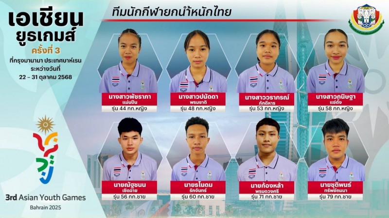สมาคมกีฬายกน้ำหนักฯ เปิดโผ 8 จอมพลังดาวรุ่งชายและหญิงทีมชาติไทย ชุดสู้ศึกมหกรรมกีฬาเอเชียนยูธเกมส์ ครั้งที่ 3 วันที่ 22-31 ตุลาคม 2568 ที่บาห์เรน