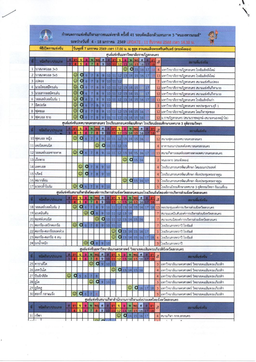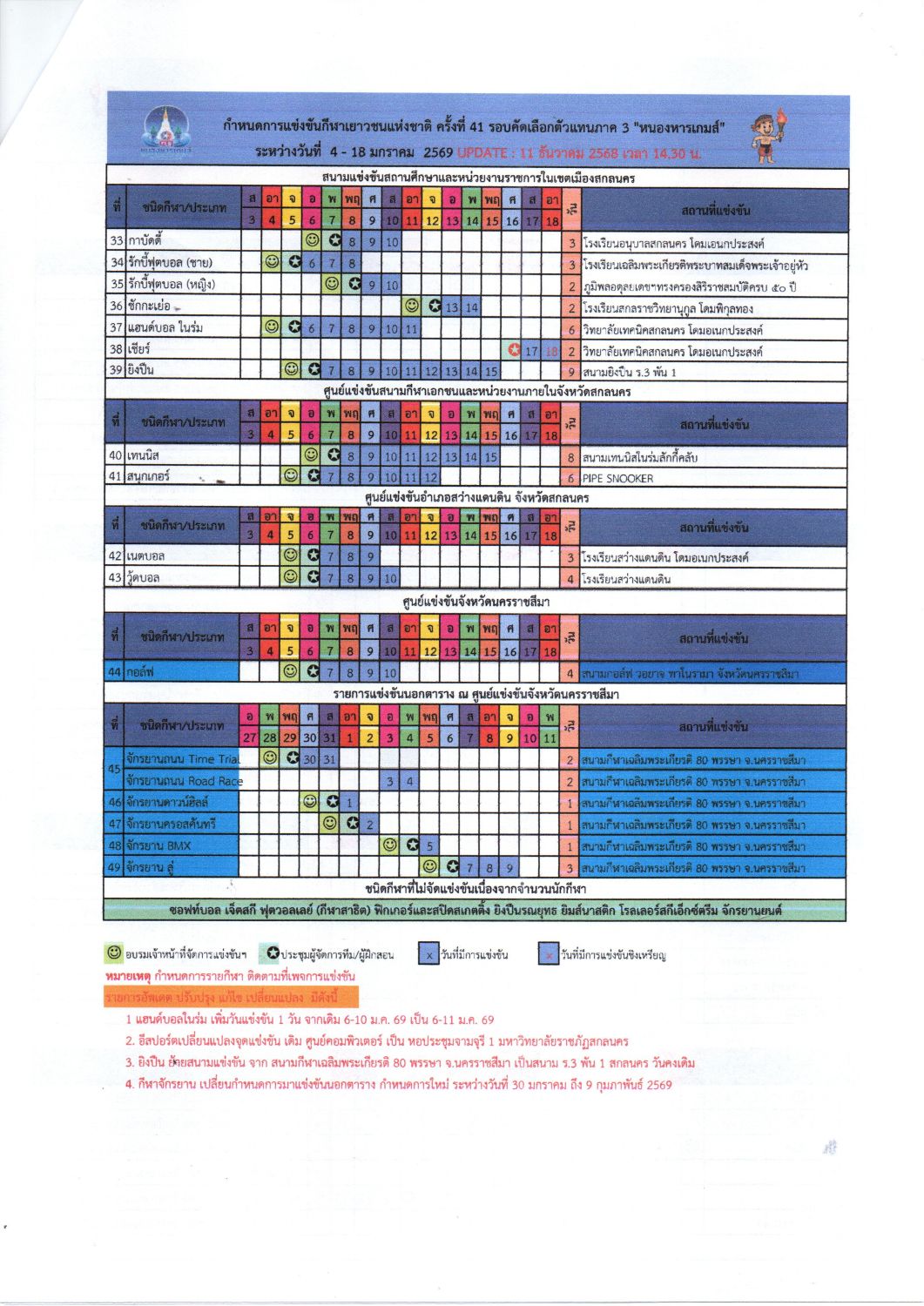 ตารางการแข่งขันกีฬาเยาวชนแห่งชาติ ครั้งที่ 41 รอบคัดเลือกตัวแทนภาค 3 "หนองหารเกมส์" ณ จังหวัดสกลนคร